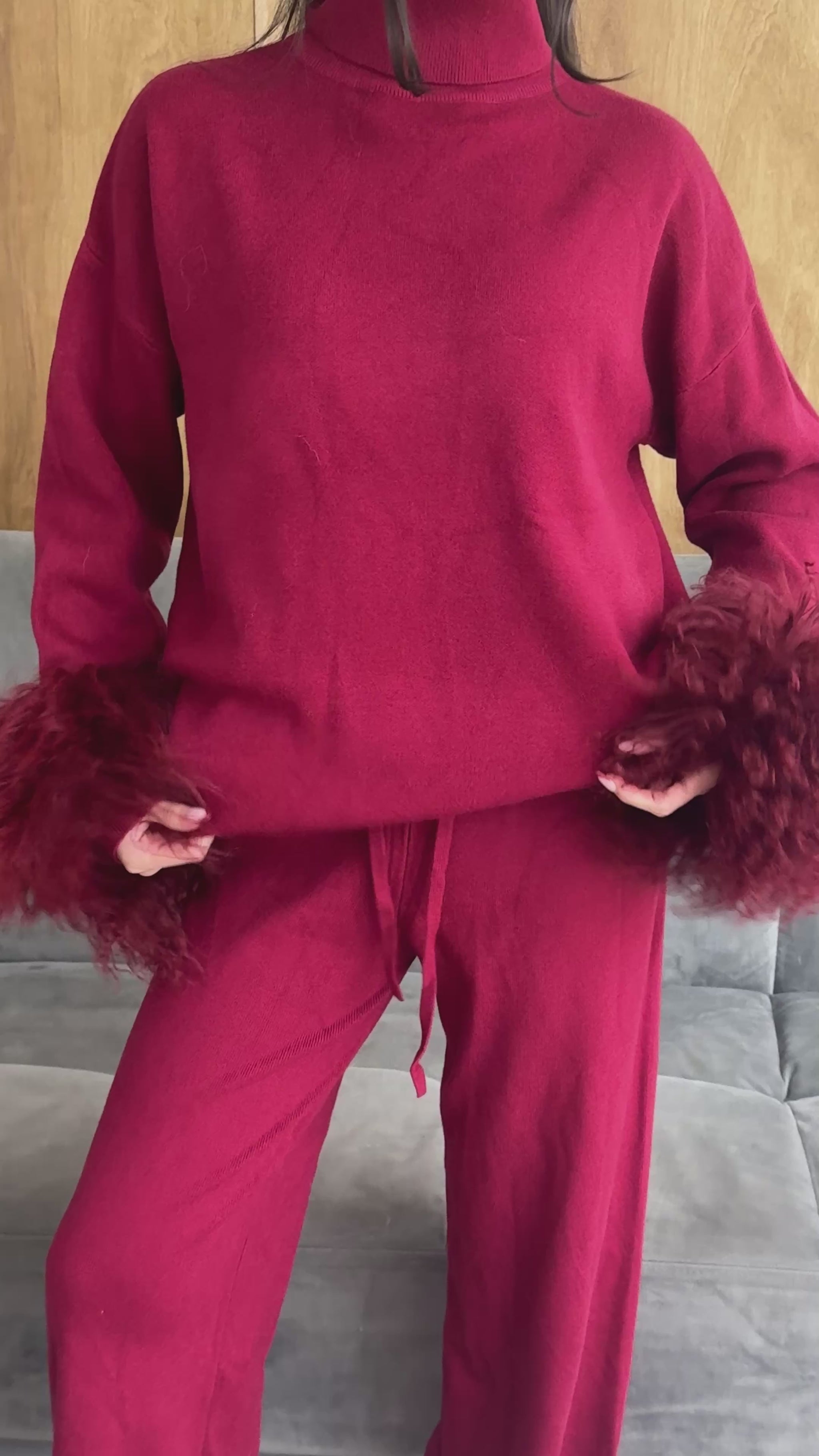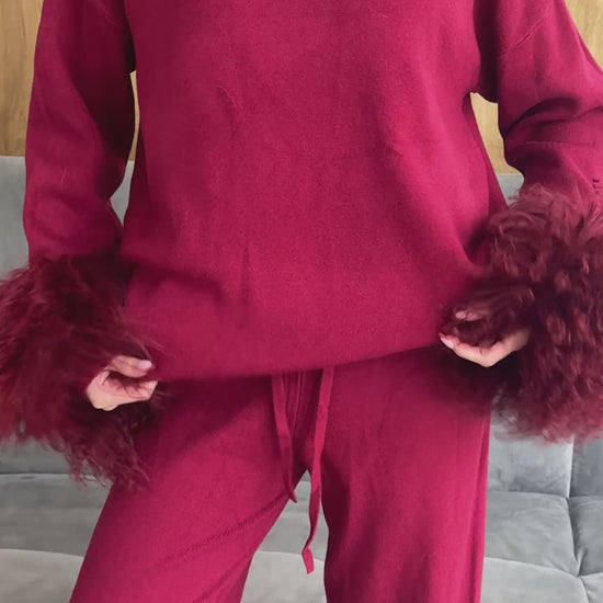 The Nadira Mongolian Cuff Set is a refined knit two-piece designed for elevated winter dressing. Featuring a relaxed high-neck sweater and fluid wide-leg trousers, Nadira is finished with statement Mongolian fur cuffs for a soft yet powerful silhouette.